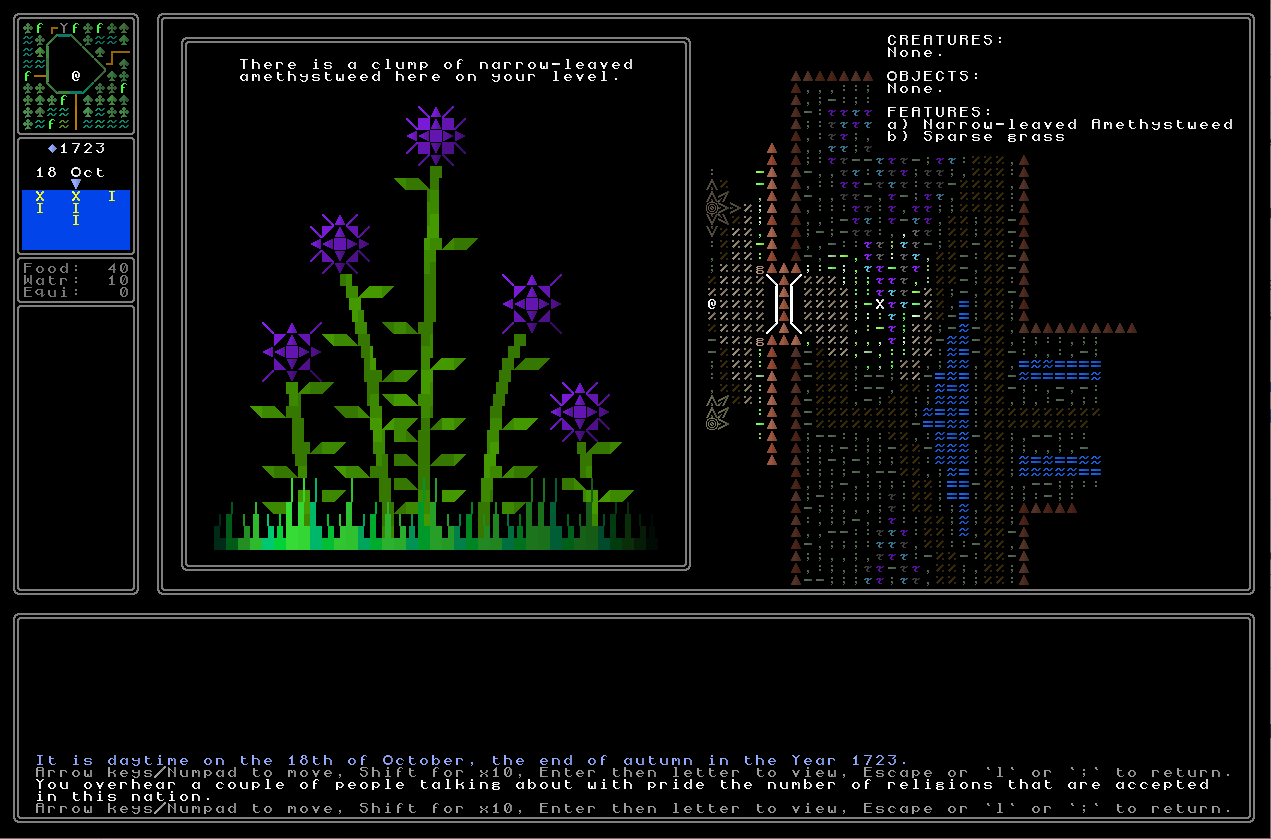The game presently generates large numbers of plants and animals – though only the plants at present actually appear in the game world with lovely new generated images in 0.10 – all of which are designed both to enhance and further the alive-ness of the game world, but also to serve as potential clues.