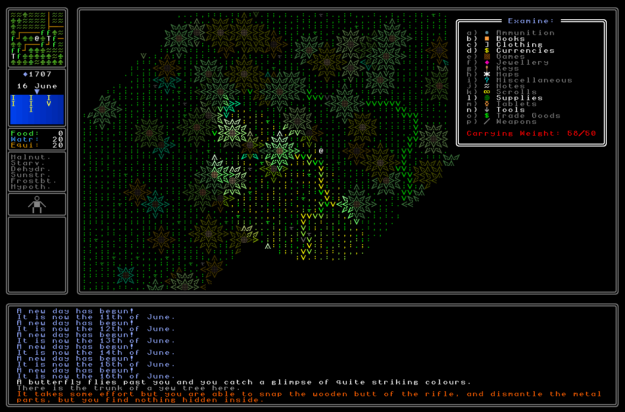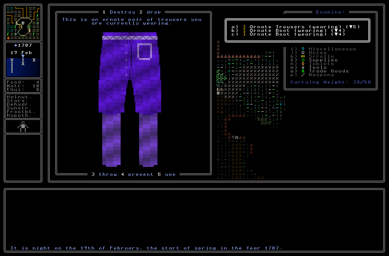 Pressing the number shown by each function will then do that thing! I couldn’t use the letters because – as you’ll note on the right-hand side – it is with letters that you navigate the inventory, so ‘d’ for instance could not be both ‘d’rop and ‘look at the fourth item in your inventory’ once you’re actually in the inventory. You will however also later be able to press ‘D’, ‘d’, ‘p’, ‘t’, or ‘u’ to go into your inventory with that function pre-selected; I think it makes sense to give the user both options, as sometimes you’ll probably want to browse your items before deciding what to do, while other times you’ll already know what needs doing but might not necessarily have the item already in mind. Right now it’s the former functionality (inventory and then action) which is implemented, but the latter will be following shortly behind.