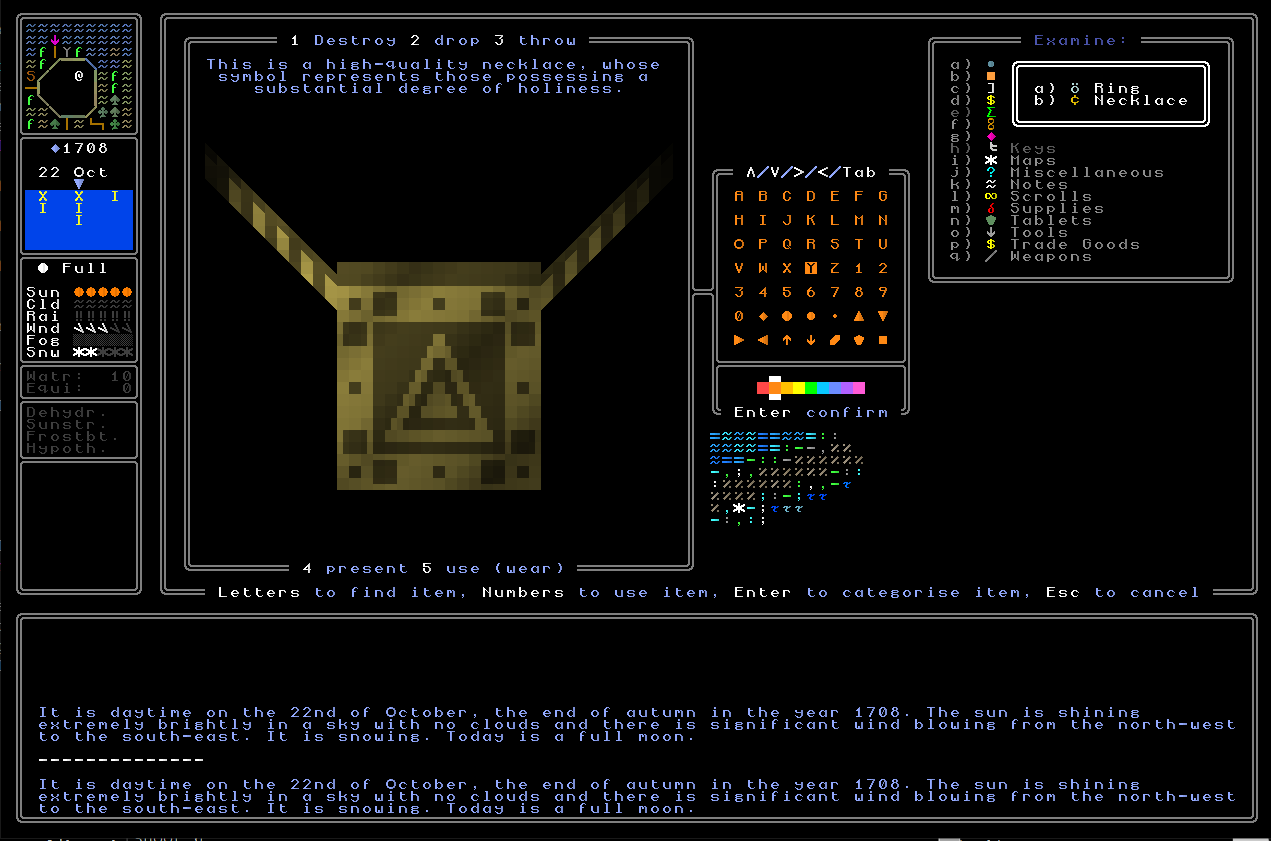 Finally for this week, I’ve now added a major new facility to all the items you have in your inventory – the ability to categorize them. This is done by pressing Enter when you’re looking at an item. Other item interactions use the number keys, and these can vary from item to item depending on what it can be used to do, but Enter is consistent. This then brings up a little additional window next to the item where you select a character, and the colour, with which you want to code that item. This looks like this: