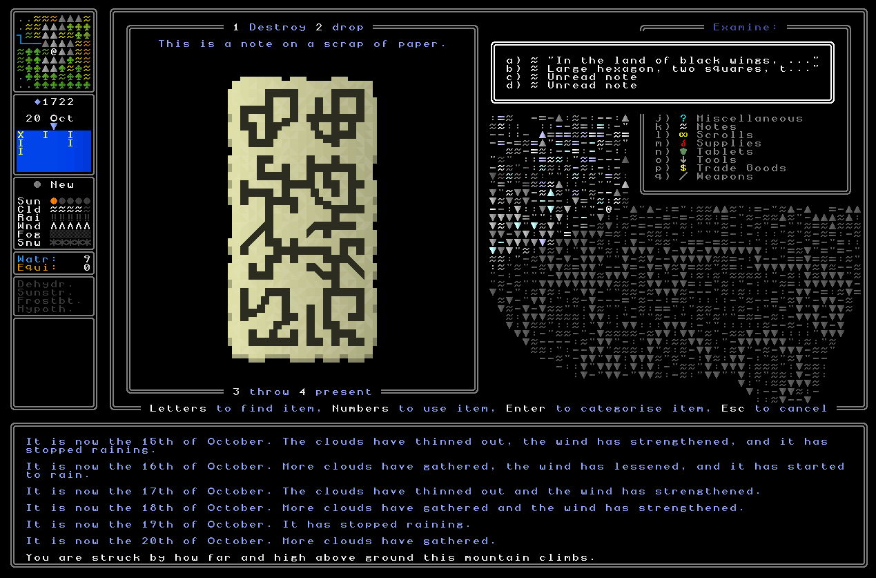 I’m blown away by the sheer variety of clue archetypes and possibilities on display here. I very much echo Neil’s comment about it being “mind-boggling”! I can definitely see players asking for help on forums, etc with clues and more experienced players helping them out with possible interpretations. Since each generated game world is unique, there’s only so much that other players will be able to assist with, but I think that’s a good thing. I can imagine a surge of excitement that a player will feel when they connect a clue to something in their game world (e.g., this symbol represents this particular culture! or, these initials are of THIS town on the map!). Maybe players will post in-game maps or dumps of their in-game journal so other players can look them over. Will there be a way to export the map and journal to files?
