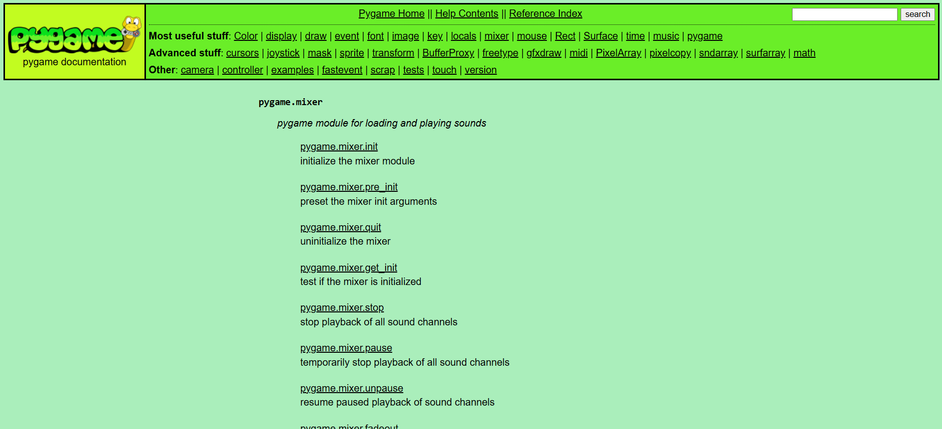 Equally, the lack of looping functionality was a serious problem. Obviously if we talk about background music, or even just background sound effects for things like rain, we want these to be able to loop – and playsound3 doesn’t have a way to do the looping. Now, it was soon apparent that it would be comparatively trivial for me to implement loop coding myself, except for the fact that some of the keyboard inputs in URR are handled via tcod’s check_for_keypress function, and others are handled via the wait_for_keypress function. What this meant, essentially, is that the while I could trivially write a piece of code to check whether the background music is still playing or not (and if it’s not then play it again), with so many wait_for_keypress implementations, the game pauses there until the player next puts in a keyboard input – and so can’t be continually checking for the background sounds having concluded, and hence needing to be restarted. I then spent a while experimenting with how easy these would be to replace, and found that they would in fact be quite demanding to replace, given that all the code around a given keyboard input detection is built with the expectation of waiting for a keypress rather than checking for keypress, i.e. completing a block of code and showing something sensible to the player and then awaiting a new input. I played around with this a bit, but I did struggle with to find an effective implementation here that wasn’t too CPU-intensive. The more thought about it as well, the more I increasingly realised that even if I was able to handle this looping issue, I still wouldn’t be able to handle the volume issue, resulting in tracks having quite a sharp end or beginning when you’re transitioning from one thing into another. As such, I decided that after 14 years, the time had finally come to check out by far the most well-used and well-known library for Python games – pygame.