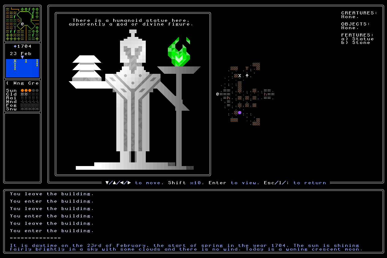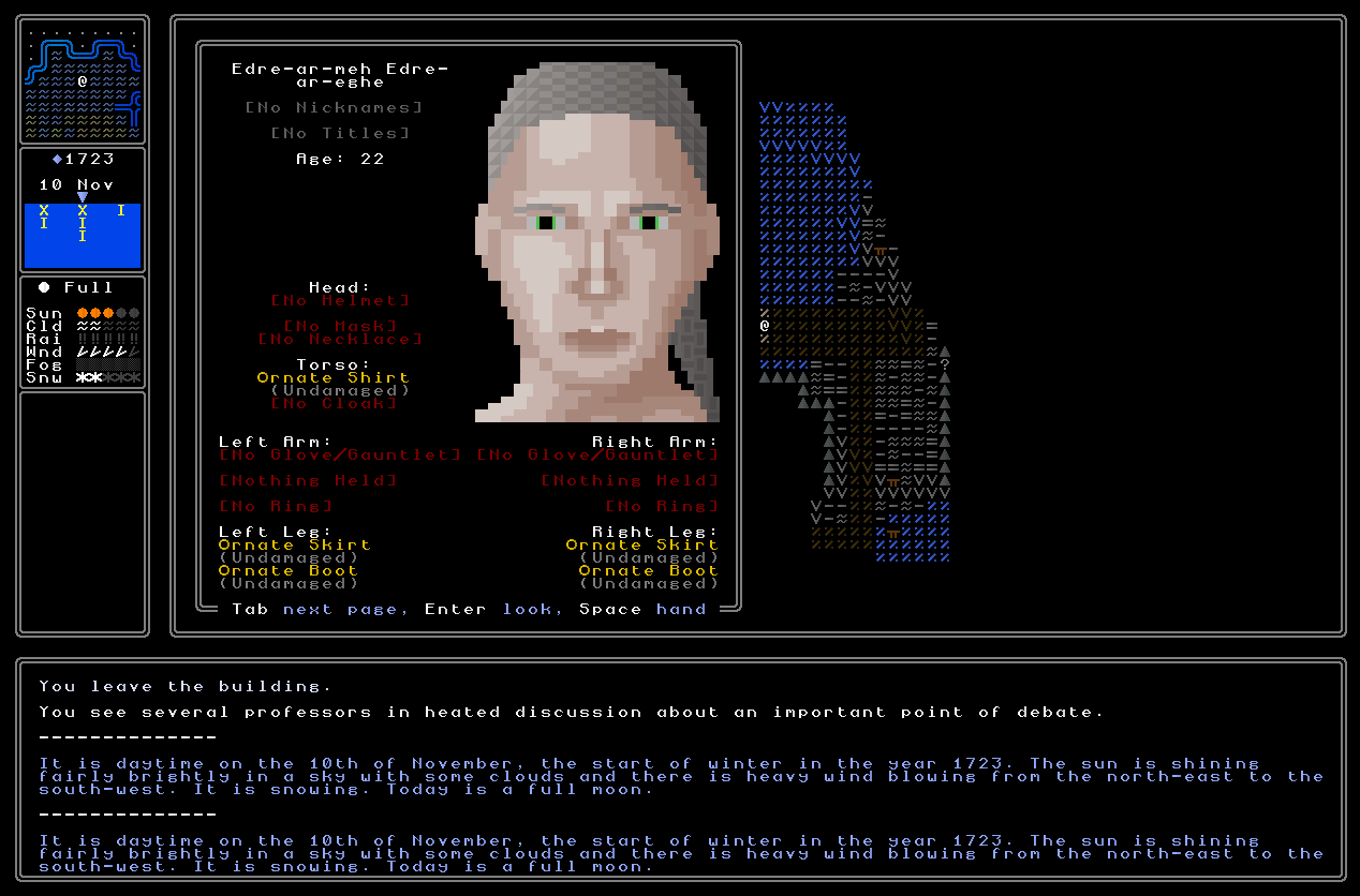 - You can now press ‘@’ to look at yourself while you’re on the travel screen, not just when you’re on foot in a map grid.