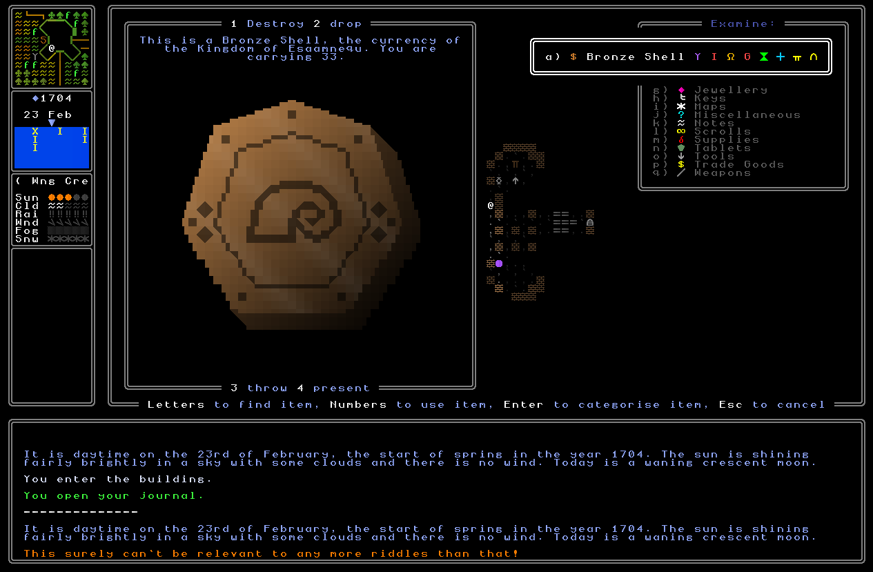 - Alcohol bottles now have a purchase price and a sale price that takes account of how much alcohol is actually in there, with empty bottles being worth almost nothing (to sell; you’d never find these for buying). As an aside, at some point I’ll need to adjust these into a generic “bottle” item category, and do away with canteens and just have everything in bottles whose content can be changed (as that’ll really increase functionality and add more interesting decision-making) – but that’s not a 0.11 issue.