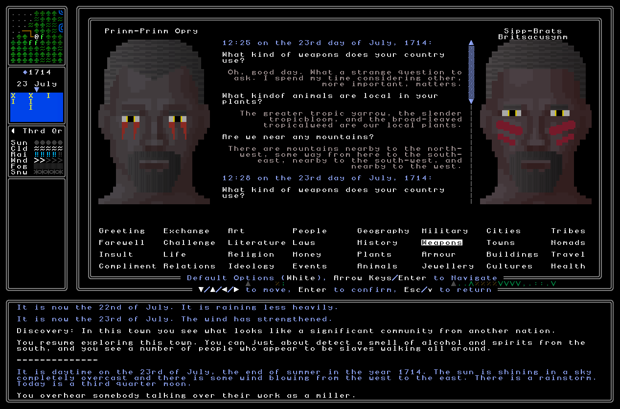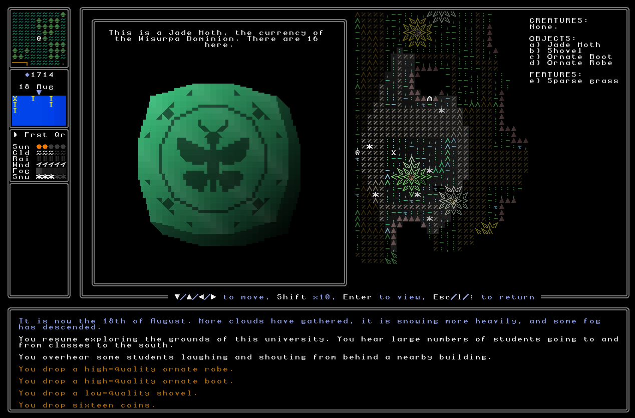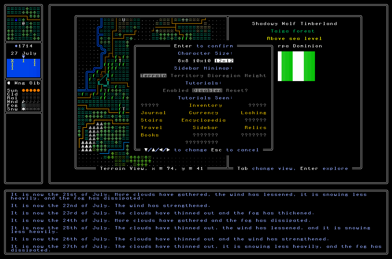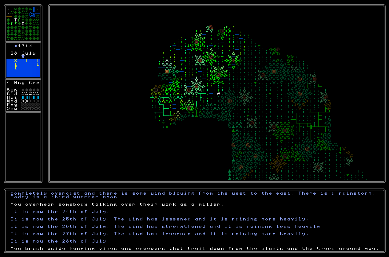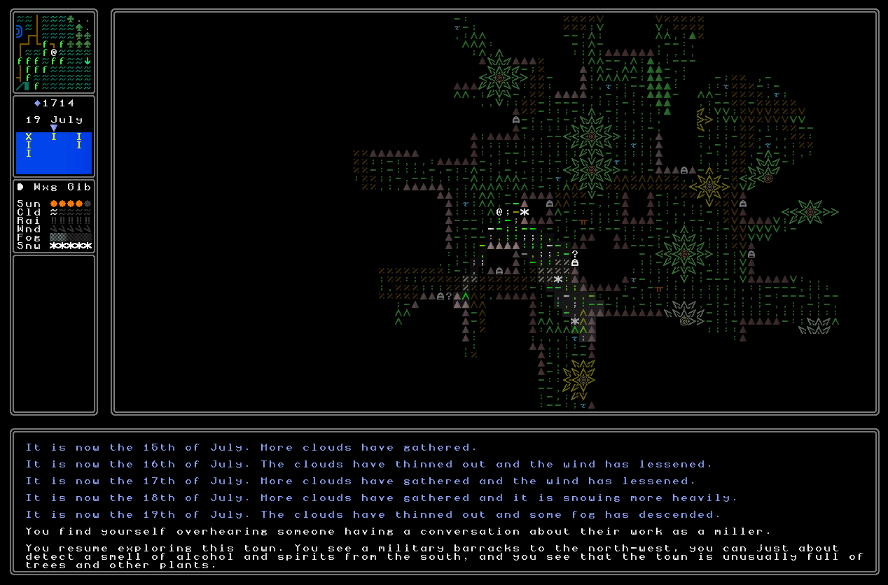 - Weather is now more logically generated as a result of adding certain restrictions when you enter the proximity of certain terrain types (e.g. so if there is somehow a polar region not a million miles from a desert region, any snow will definitely fizzle out before you reach the sandy area).