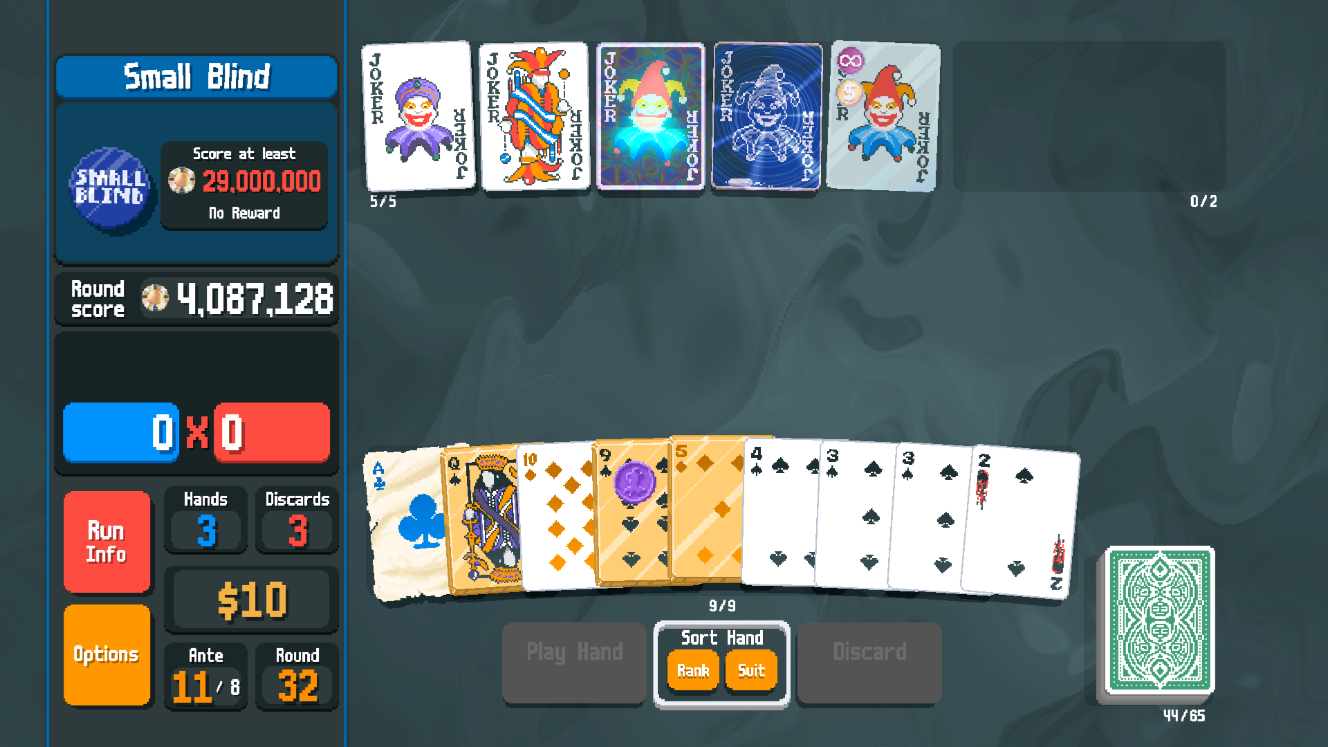 It was also interesting to see elements of the game that didn’t really click with me at all – such as the TCG bit. You can buy cards in packs, and you open those packs, and I’ve seen enough Twitch to know that people really enjoy opening card packs… but I’ve never done that in my life in the real world, so that didn’t really “do” anything for me. Similarly, the speed of the game and its core loop did fly a bit too close to “just one more turn!” game design for me compared to what I normally like – and I even found myself sometimes becoming a little mindless in my play, which ordinarily never happens. Yet on a good run, where one made smart choices, and found interesting combos, there was a great deal of satisfaction to be had (and gosh, that pixel art is great). Ultimately the roguelite, card game, and deckbuilding elements of this game, I really like… but the clicker / incremental, autobattler, and TCG elements, leave me completely cold. The variety of jokers and the play styles they create is impressive (and the pixel art is very charming)… yet so many runs play in such similar ways (even on the highest difficulty), and there is very little tactical depth to your decisions once your build is settled, nor do builds change later in a run and adapt to new developments as they do in most roguelikes and roguelites alike. I’m overall honestly surprised the game has been as successful it has been, which I don’t mean in a derisive way in the least, but rather an admission of a clear gap in my own understanding of the contemporary games market. Have games with vaguely gambling-esque mechanics and aesthetics become this popular this fast? Are games that touch on incremental / clicker and autobattler mechanics now so widely loved? Does everyone else on the planet except me play TCG games, and thus loved all the TCG elements that I didn’t have any real emotional connection to or derive any particular joy from? I have no idea about the answers to any of these questions – but either way, the game’s a winner, even if it must be cranked up to the maximum difficulty immediately in order to be a thoughtful strategic game, instead of a clicker yawnfest. Unlock all, and have fun!