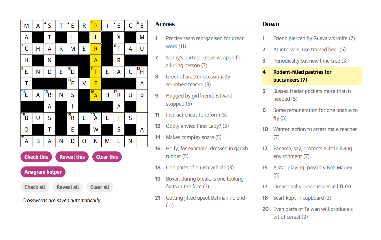 I have long been an avid enjoyer of traditional crosswords, mostly those in the Guardian, though I’ve also on occasion enjoyed the New York Times ones (even if the required knowledge of peculiar Americana often exceeds my own). In my late teen and early adult years I briefly tried cryptic crosswords, and was very pleased with myself when I was able to decipher an anagrammatic clue, and equally pleased when I could understand – after seeing the answer – why the answer was the answer, even if the process of getting the answer seemed ludicrously difficult. However, in January of this year I decided to take the plunge, specifically as a result of the Guardian’s new “quick cryptic” crosswords, which have been specifically designed to ease the new cryptic crossworder solver into the conventions and the types of clues that one might expect to find. Each of these helpfully explains that the clues can only be one of four “types” – such as an anagram, or a hidden word within the clue, and so on – and then all clues within that puzzle must adhere to those specifications. With these pieces in mind, and the extra thing these crosswords kindly give you (that a traditional crossword clue is also hidden within the wider clue), cryptic crosswords are promptly transformed from the most bizarre, baffling, and inaccessible form of puzzle, into actually… something one can do! And not just something one can do, but something that’s really very fun to do, and a really rewarding and satisfying mental challenge. It’s really gratifying to find one’s way through the maze in a clue to understand exactly what it’s getting at, and to start to spot some of the hints and signifiers about what type of clue it might be. Without that kind of guidance and without the experience of seeing the important parts of a clue, cryptic crosswords really are tremendously inaccessible things, and so I have to give full credit to this series for doing a fantastic job of easing me into the style.