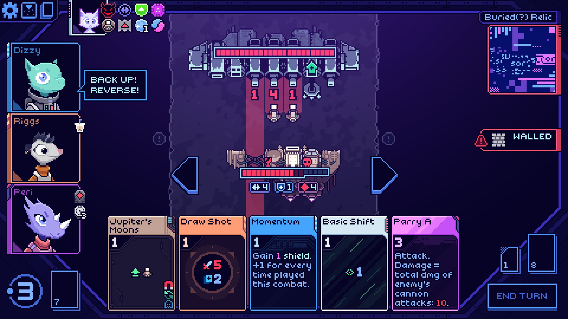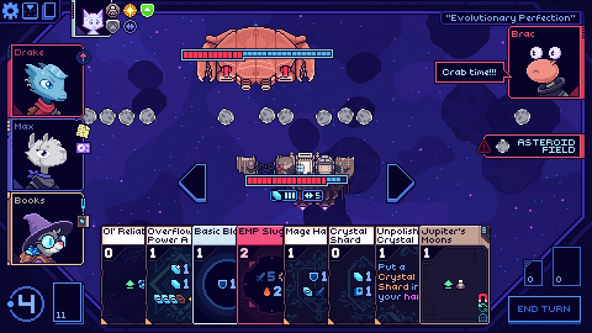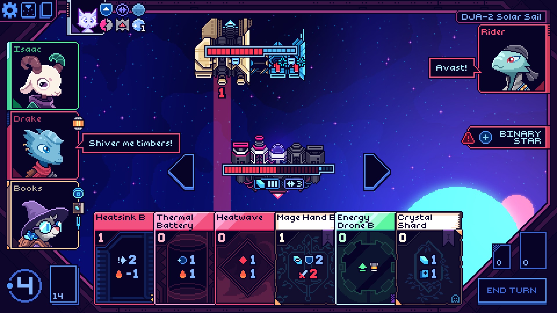 The second is the pixel art. The game is honestly just so beautiful, with art that is absolutely crisp and clear and unambiguous, but also has an incredible amount of character. I wouldn’t say the art style is cartoonish, but it’s certainly not going for a “realistic” style (the unrealism of its content notwithstanding) either, but instead something very nicely in the middle, down-to-earth and clear but also with a ton of character and a ton of attention paid to this element of the game. Your cards are clear and just lovely to look at in their own right, but the characters are the real stand-out here. Both the potential members of your crew, and indeed the pilot of every enemy vessel you might encounter, have so much character and soul in them, which is further boosted by some of the many slightly alternate appearances the characters can have based on in-game events, such as looking shocked, embarrassed, afraid, happy, and so forth. The ships, meanwhile, again have so much distinctive character to them (I know I’m using “character” a lot in this paragraph, and I apologise for that, but it’s the best word I’m able to find to address what I’m trying to get across here) and there’s just so much care put into every single visual aspect of the game. The backgrounds are also beautiful and have some very pleasing parallax scrolling effects, and the relics and artefacts you can find are similarly very pleasing to the eye, especially with such a small number of pixels to fit something into. Overall the entire game world has an extremely coherent aesthetic which is always charming, always clear and crisp, frequently very endearing and very funny, but which never gets in the way of conveying the essential information that you’ve got to be giving someone playing a roguelike or roguelite game (and the conveyance of that information is, itself, very pleasing, and looks exactly like everything else in the game). There’s just so much care and attention, even to visuals the player might only see once in their entire time playing the game, and the sense of real commitment to creating something gorgeous to look at just shines through on every screen.