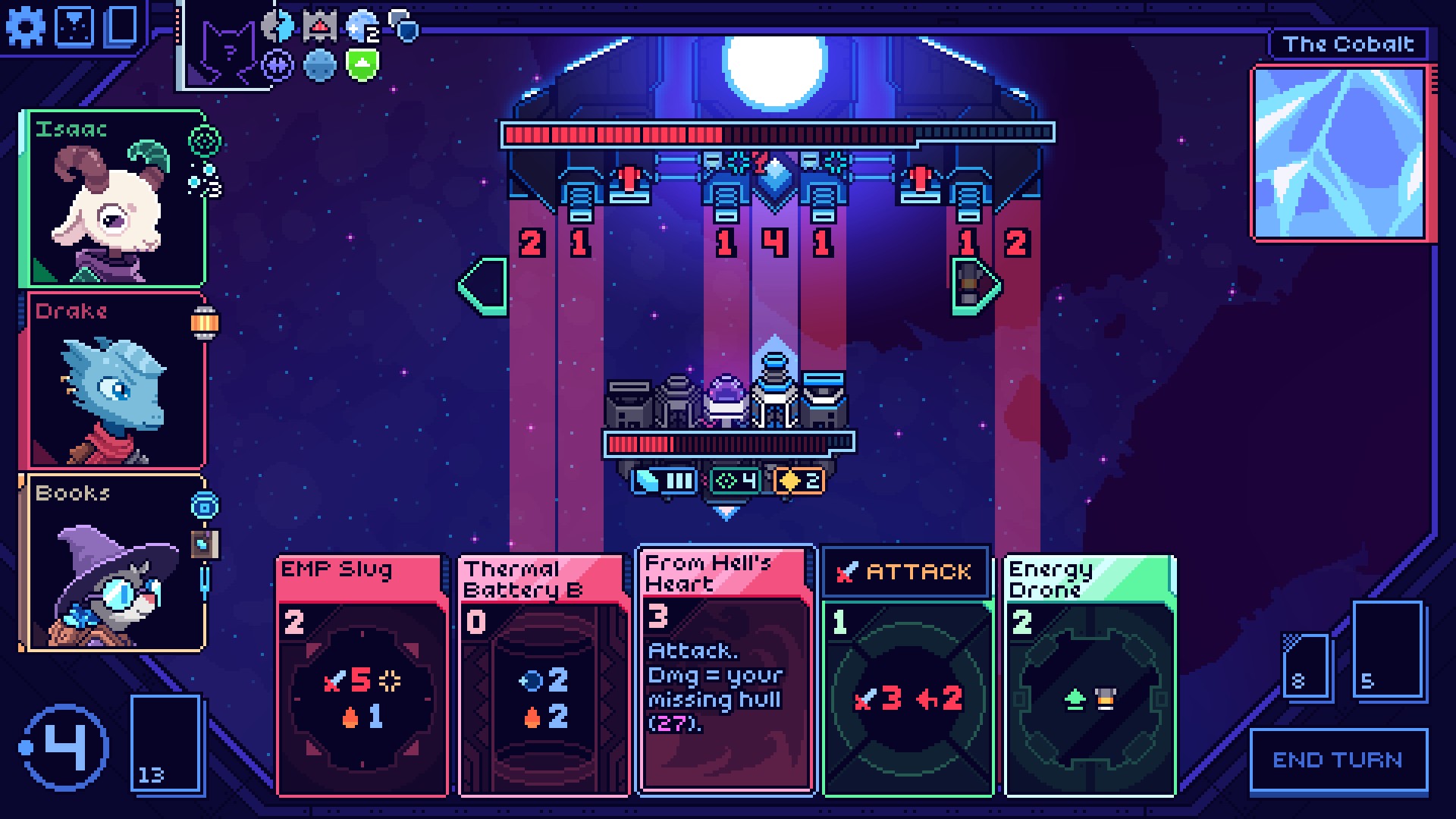 And now we come to my other favourite game of this year – the wonderful, very challenging, utterly charming and earnest, and frankly just brilliant, Cobalt Core. I rate Slay the Spire as one of the peak roguelite games, and certainly the standard to beat if creating any kind of deckbuilding game, and I suppose I’d long held off trying Cobalt Core – or any of the others that have come out since, for that matter – in a belief that they just couldn’t possibly be better, or indeed as good as StS, so why even bother? I knew I’d play them eventually, don’t get me wrong, but it didn’t seem like a priority. Yet at the start of this year, deep in the quagmire of preparing teaching for 700 students, making huge changes to the lectures and courses I deliver, and dealing with a ton of administrative work as well, I decided I needed a run-based game to help see me through. Do an hour’s work, do a run, then repeat; or do an hour’s work, do a chapter or a battle or whatever, and then repeat. As noted in the Infra Arcana review, this is a technique I’ve found highly effective in the past for getting through work that isn’t at all intellectually demanding, but very time and energy and attention demanding, and so I scrolled over my Steam list and Cobalt Core jumped out at me. Time to give it a go, I thought! So I booted it up, and hopped into my spacecraft with my three animal companions / crewmates for the first time, and set out on my first journey. I cannot honestly say my first journey ended in anything approaching overwhelming success, and certainly not victory, but I was immediately struck by a number of things. Each of these has indeed carried over into my bigger thoughts on this game, and the more I’ve played, the more I’ve come to appreciate the care and attention that really has been put into each of these elements. They grabbed me immediately, but then also continued to expand, and deliver, in run after run, all adding up to a game that I have to say I now absolutely adore.