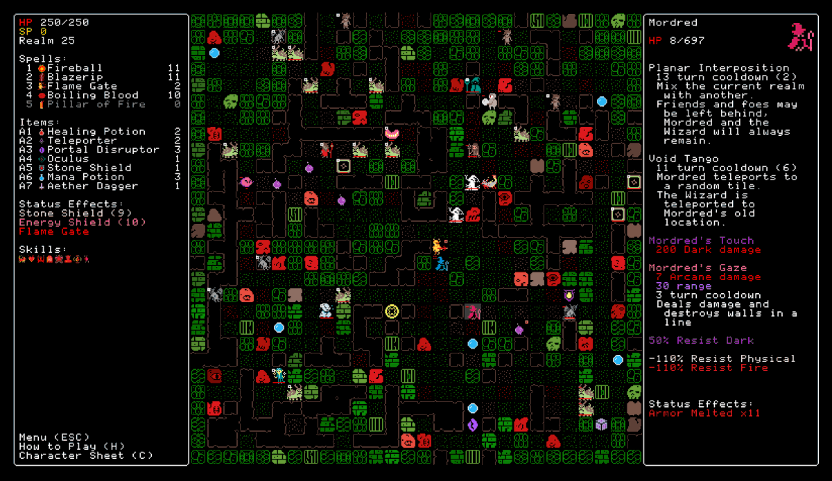 On my list for a long time, I decided this year was the year to try Rift Wizard. This game casts you as a wizard (!) who goes through these things called rifts (!!) filled with vile creatures of many types and with many powers, and your goal is to construct a character capable of surviving twenty-four of them, and then dealing with the final boss. My first attempt ended in disaster because I didn’t have much of a clue what I was doing and I really wasn’t paying enough attention, but my second attempt took me to the final boss. When I arrived at Mordred the first time I managed to give him a decent run for his money – taking two of his five lives – but I had few items remaining that could help, he countered my exact build reasonably well, and I really hadn’t taken a part through the early levels that was anything approaching optimal. His ability to change the map and get rid of your summons was crippling, I lacked much direct damage, and I had no way to follow him around (or at least get back in range) each time he teleported. Once I knew what I was doing, however, my third playthrough – screenshot above – yielded victory, and with a lot of resources to spare, too! The major difference came partly just from a greater understanding of which rifts to take and which to overlook earlier in the game, of course, but it also came partly from knowing exactly what Mordred was going to do, and thus what I would have to counter. In the process, I noticed that my first three runs of Rift Wizard mirrored my first three on FTL (a decade or so ago) exactly! First run is just about understanding what’s going on; second run gets to the final boss, but I die; third run is a first victory. In the process I came to really love the game’s graphics, the complexity and detail of some of its mechanics, and just how interesting the spells – and especially their combinations – really are. Even with that first win, though, and one I enjoyed a lot, the game was far from finished, and I’ve had some fun attempting other builds…