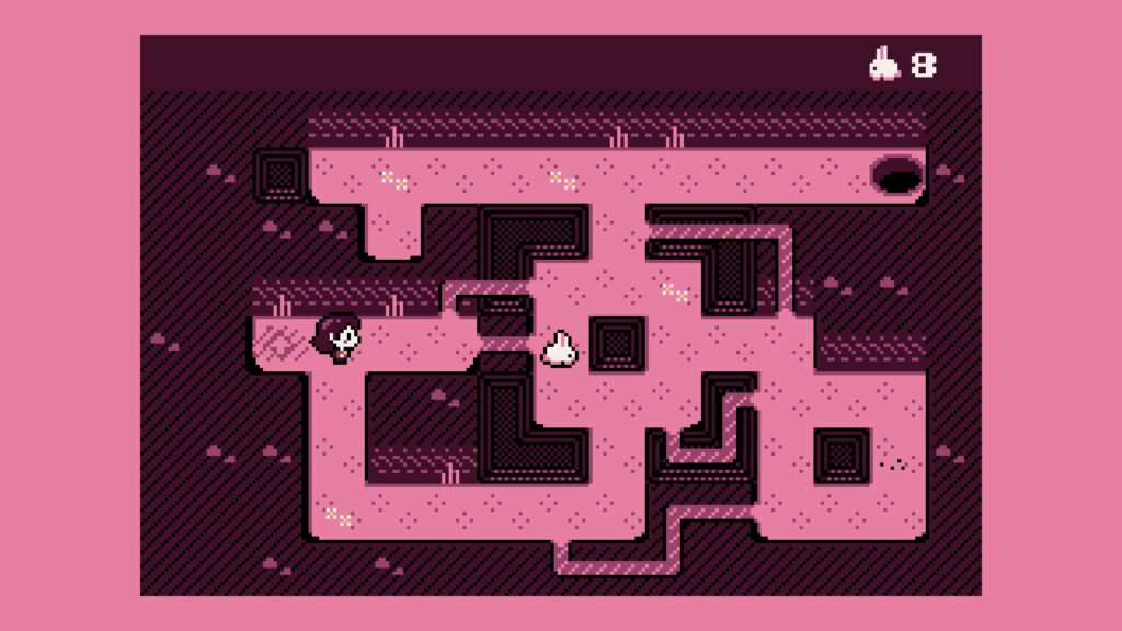 Yet even if this hadn’t been true… I’m not sure I would have kept playing, and there’s another reason for that. The problem is that all the levels look extremely similar, since there’s a very finite number of tiles that are used on all the levels, and all those tiles themselves look very similar, and so I found myself quickly not becoming excited when I moved onto the next stage. I might just complete a stage with some open areas and some of the burrows / tubes / runs / whatever the narrow parts are called that only the rabbits can go down, and then I’d reach a new level… also with loads of open areas and loads of burrows / whatever. And the next level. And the next level. And the next one, too, and the dozen or even hundred after that. The levels thus quickly blurred in my mind and I was struggling to get a real sense of distinctiveness from these stages, or a sense that this stage was offering something exciting and interesting which the previous ones didn’t. There’s a sharp disjuncture here with a game like Cube Escape, actually, although a much fairer comparison is something like Chip’s Challenge, since that’s also about moving on a grid and sometimes interacting with other creatures in that grid as well. Each level in CC has a real sense of place which emerges primarily from the aesthetics, and from the combination of puzzle elements which are in that level but not in the other levels. Here, by contrast, nowhere really felt like anywhere, and everywhere just felt like everywhere else. I just didn’t have the motivation to keep slogging through them, unfortunately, as charming as both the aesthetics (eye-strain aside) and concept were. I thus wound up calling it a day after around a half-dozen hours, appreciating the game’s novelty and the simplicity of its core mechanics, as well as its ability to reveal new depths and surprising higher-level puzzles as you go on, but the visuals and the gameplay were ultimately just not for me.