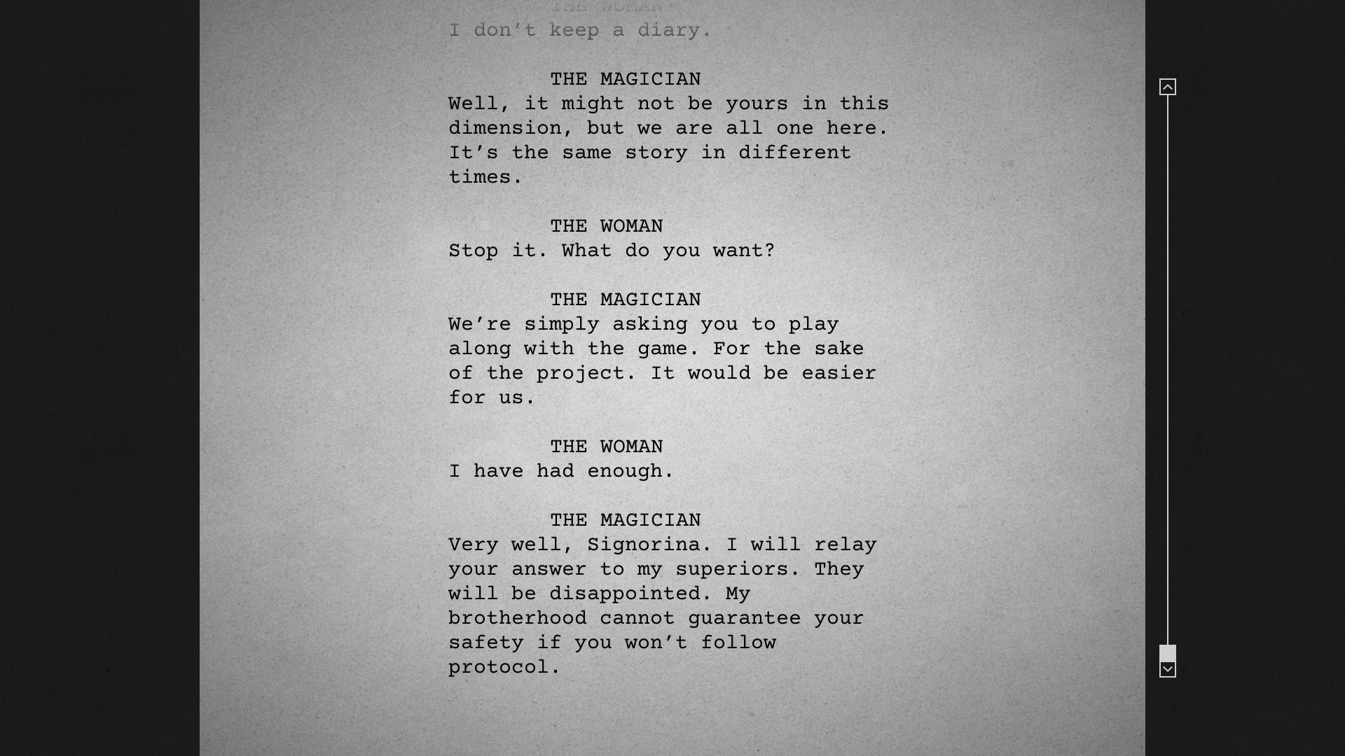 This trap, however, of mistaking something being ambiguous (i.e. possessing many equally logical interpretations but only one is correct) for something being cryptic (i.e. possessing only one totally valid interpretation which is the correct one), sadly led to the weaker parts of the game. Some of the fonts used (particularly the one for Hebrew numbers) were genuinely unclear and that led to many possible interpretations of certain things, while other puzzles had clues that had multiple potential answers, which then had to be fed into other things, and thus one had to do many other steps contingent on those early steps before being able to know which is the correct interpretation of a certain clue earlier in the chain. These long chains of sequential deductions from unclear language with no way to check one’s working (which quickly can spiral to dozens or more possibilities that seem to equally well fulfil the clue’s instructions) were damned frustrating. One extreme example would be the second and third stanzas on page 9, which I would propose have around a dozen possible and utterly reasonable interpretations, but take so much effort to test out. Coupled with, as I say, a lack of visual clarity in a few places, and by a few clues that are perhaps a little iffy, there was some real frustration here. I nevertheless applaud Alchemia with all I have for its wild ambition and confidence in the player – the parts that flowed smoothly I truly adored (i.e. solutions and pathways that were cryptic but never ambiguous) – but the parts that were just too vague to make headway in without a lot of trial and error quickly made me sour on the whole thing. Perhaps fifteen years ago I would have been less frustrated by this, but I don’t have time to create and then check two dozen ciphertexts I’ve been able to put together, all of which seem to fulfil the instructions equally well, to see which is the correct one and which twenty-three are incorrect (despite being entirely reasonable interpretations of the clues). A follow-up to this game, heeding some of these lessons from other cryptic riddles games – be cryptic, but never ambiguous, in all ways (clues, visuals, language use) – would be something incredible, and something I’d be hugely excited to play.