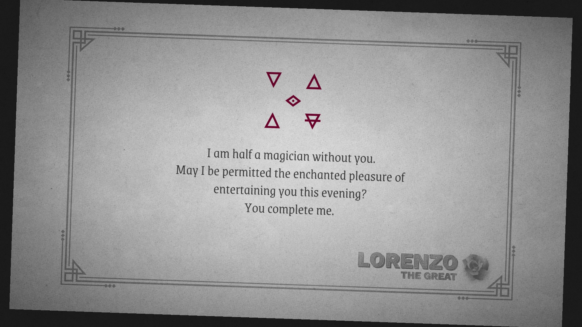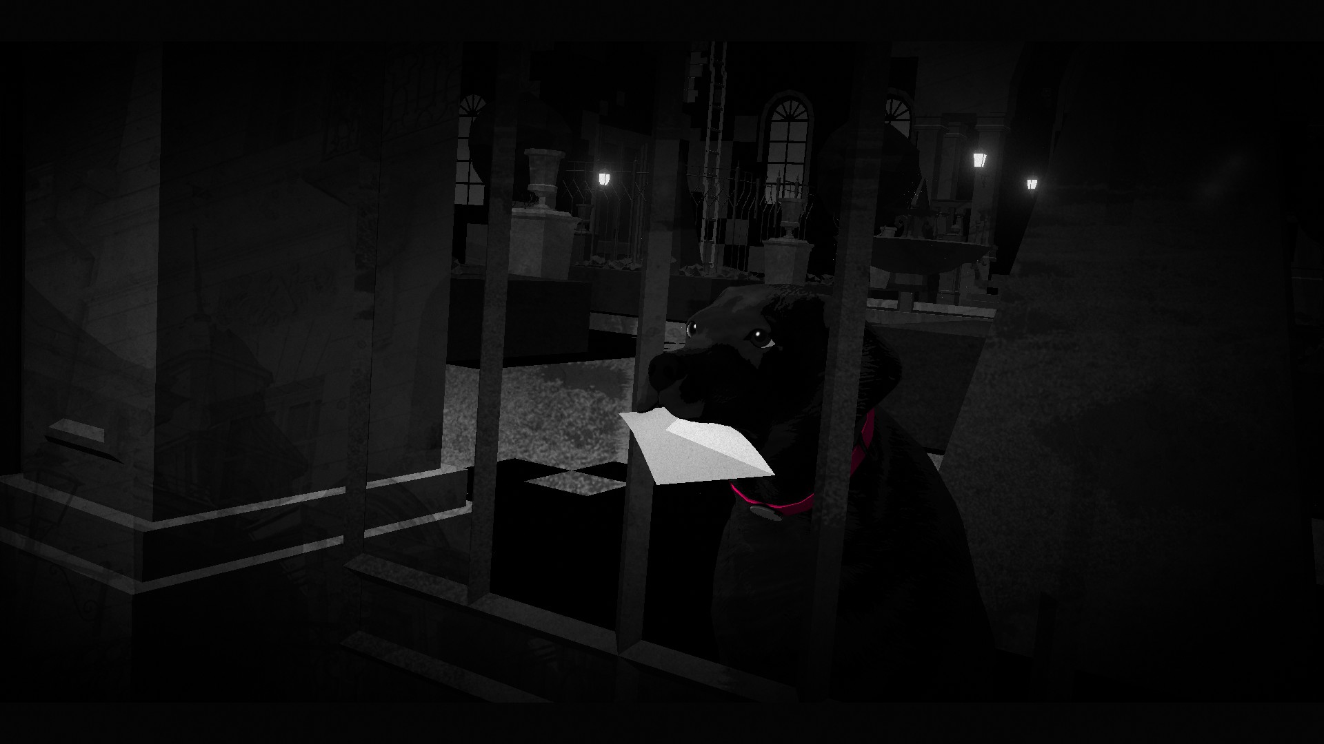 Finally, beyond all of that, the game wasn’t just a visually and aurally beautiful place to spend time, and a source of genuinely excellent puzzles, and a source of that delightful “falling down a rabbit hole” feeling I so eagerly seek in games and most often find in cryptic riddle games. All of these things were brilliant, of course, and I would still be writing a rave review even if that had been all, but the game somehow also – especially in its conclusion – somehow contributed to be a genuinely moving piece of art, and one I’m really pleased I got to experience completely free of spoilers. It’s a delightful and mesmerizing rabbit-hole that goes deeper and deeper the more you play, unravelling both a fantastic mystery told through really engaging and interesting and novel puzzles, but also a tragedy, and a call to the viewer to not let life pass them by and to seize everything there is to be seized. It has (especially at the end) genuinely significant emotional weight, and in doing so it might perhaps – whisper it – have even elicited a tear or two from me. The game’s finale brings together so elegantly all the puzzles, the aesthetics (for there are several, including some I haven’t shown off here, in order to avoid spoilers about some of the more surprising and clever aspects), and the story you’ve been getting glimpses of but probably haven’t quite pulled together, into something with an incredible degree of consistency between its story and its gameplay, and what it wants to tell you about the mysteries of life and time (in this regard, something like The Outer Wilds is an obvious comparison). What a glorious, madly ambitious, challenging and engaging, utterly delightful and incredibly compelling piece of work this game is, and I recommend it in the strongest terms to anyone who enjoys deeply moving stories of tragedy and life and the human soul, head-scratching puzzles, and absolutely beautiful in-game aesthetics. Oh, and as a final thing, there is also a really good dog in the hotel’s courtyard, and you can indeed pet said dog, so that should honestly seal the deal even if nothing of the above managed it.