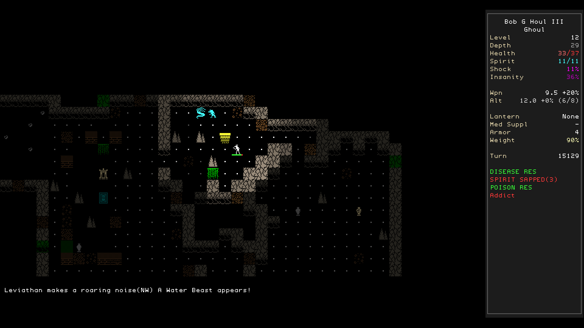 I’ve thought about playing Infra Arcana for many years, but – I don’t mind admitting – I’ve held off because especially in a game without a Wiki, mastering or even attempting to master a classic roguelike is a serious undertaking of time and effort. Indeed, for me, the joy of classic roguelikes has often been in downloading the information into one’s brain as rapidly as possible, and then using it to master these extraordinarily strategically and tactically complex games. I fully confess that, like many players, I can find a death from ignorance frustrating, whereas a death from my own mistakes is of course entirely fine. This sense has only grown as my life has become busier, and I find myself with less time to commit to classic roguelike games, and their potentially lengthy playthroughs, than I once did. This might be surprising to people reading who know my affection for cryptic riddle games, given that those games are all about the player’s ignorance, and about spending huge amounts of time trying to overcome that ignorance. Why do I hugely enjoy the latter, and yet sometimes prefer to play roguelikes with Wikis, in the case of the former? I couldn’t say – but the point is that Infra Arcana seemed to me “NetHack or DCSS without a Wiki”, and that’s a rather intimidating prospect for any sane person. Yet I decided this was the year to give it a shot because I’d heard so many very good things about it, the game often described as unusually challenging, having a great atmosphere, some novel gameplay mechanics, and an incredibly good evoking of the overall Lovecraftian or cosmic horror feeling. I also just really wanted a proper, difficult, long-term roguelike to properly sink my teeth into, potentially for several years (my days of spending a day downloading the NetHack wiki into my brain and then grinding out a win within a week in a fit of obsessive focus that only an undergraduate could manage are long over), and this seemed the one to go with. Although it took me a minute to really get into it and become familiar with the controls, so far my best run so far has taken me to the 31st floor, which is the final boss floor (I was not successful in challenging him…) and I am enjoying the game tremendously.