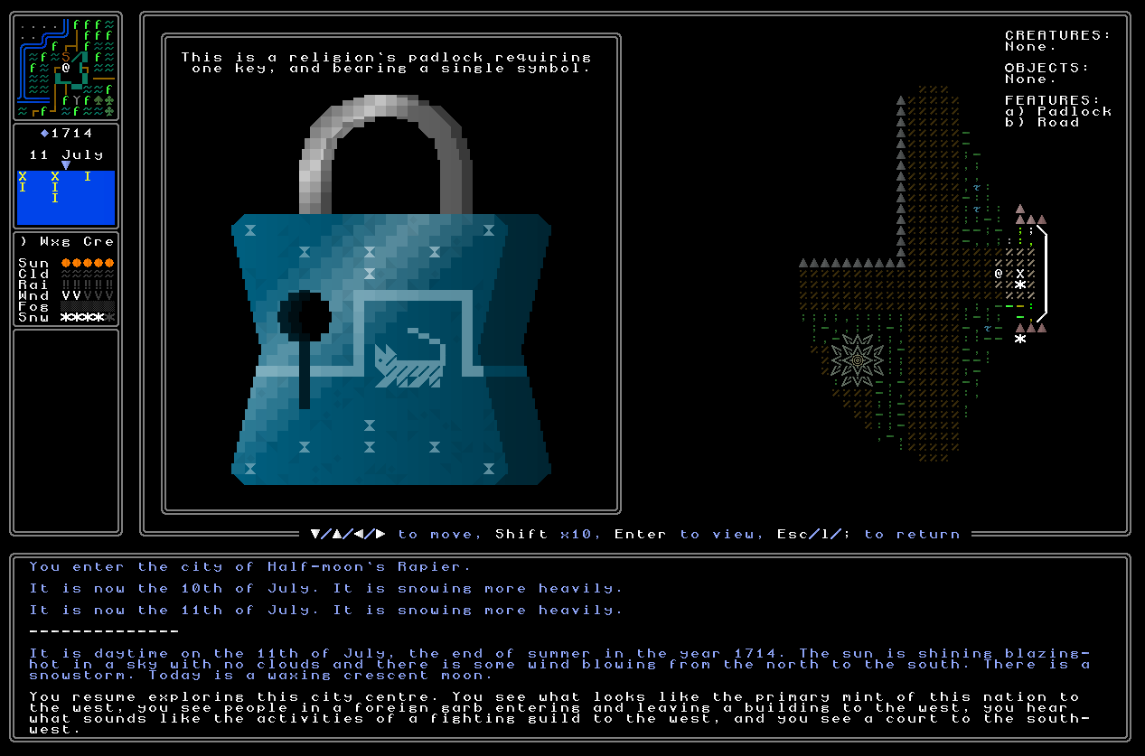Finally, on this point, the door graphics in-game – i.e. when you’re walking around and looking at the textual characters making up the game world – now reflect whether or not a door has a padlock on it, or not (chests will always have padlocks on and thus don’t need two different characters). We now have the sort of “open door” character used for all doors and doorways which are not in some way locked, and the “closed door” character (which I’ve lightly adjusted to be very clear and unambiguous) is now used everywhere that there is a padlock. This is a small thing on one level, but actually I think quite an important one, and one which I think should become very apparent and clear to both people who’ve been following the project for a long time, and people coming entirely fresh to the project once 0.11 is released. I don’t want to be wasting players’ time by encouraging them to look at doors which aren’t even locked, and we want a locked door to be immediately visually clear and recognisable regardless of where the player is or what’s going on. Until now these two characters were generally used with the closed door character being for door in and out of buildings, and the open door character being for doors within buildings (i.e. between rooms, etc), but now this has been entirely changed to ensure visual clarity. I still need to keep checking this is actually working correctly now in all cases, but I’m pretty sure it is / should be – though there is some older, weirder code involving doors, which I need to double-check in order to ensure there are no problems. Nevertheless, this is definitely an improvement in visual clarity, and one which will both prevent annoying gameplay moments – e.g. going towards a locked door thinking it’s open – and enable moments of gameplay interest – i.e. immediately recognising a locked door when you see it, and thus knowing that could be opened, and something might be behind it.