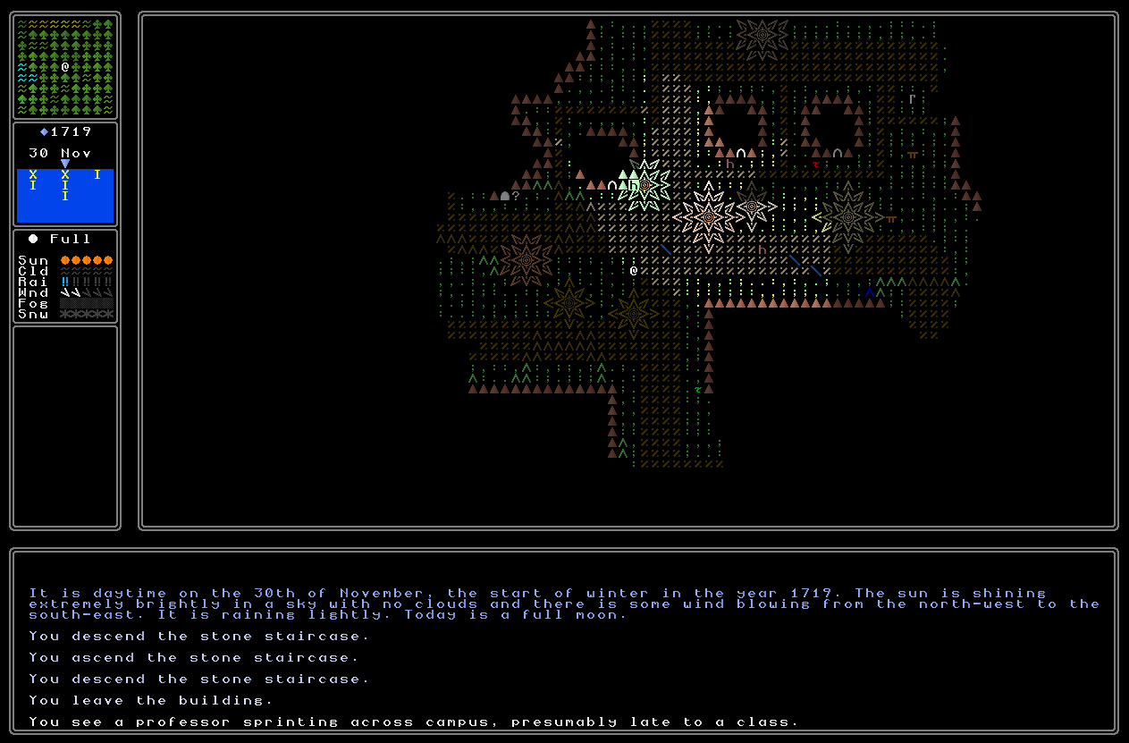 Finally, 0.10.4d is now live on the downloads page, and should be the smoothest, safest, fastest, and most reliable exploration of URR’s generated world that has ever been put out there! If you have an hour to spare, please do check it out, explore, look at things, and send me any bug reports you might come across. I should note that I am aware that going into lots of homes in a town will very rarely elicit a crash – I know the cause and it’s at the absolute top on the to-fix list, quite literally in the #1 position – and I know that under extremely rare circumstances (so rare I’m currently struggling to reproduce them) entering loads of buildings within a city centre district, and then waiting around for a long time, can also produce a crash (this being #2 on the list). Both of these are genuinely difficult to reproduce however, and even that is when I’m actively and deliberately trying to trigger them, so as long as you don’t investigate many dozens of private domiciles in towns, nor sit around for vast blocks of time in city centres, you really should be fine. Please do give it a look and let me know what you think, especially of the journal, the new start with the tutorial system, and everything else! And, again – any issues you might encounter. We’ll be doing more bug-fixing updates in the future for 0.11, but for now I really do think this ought to be a very stable version of the game indeed (fingers crossed).